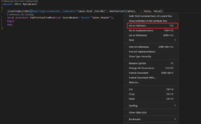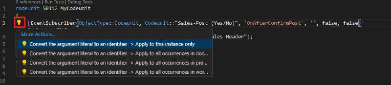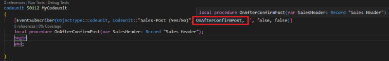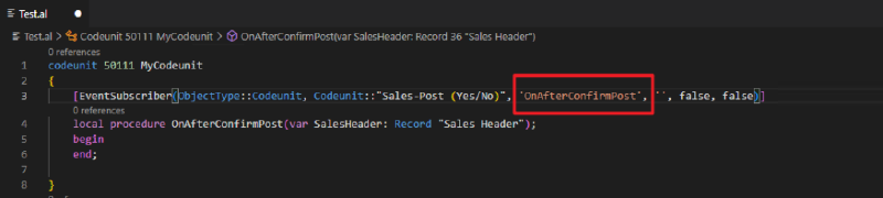 Since Business Central 2023 wave 1 (BC22), event subscriber arguments support identifier syntax instead of string literals. Using identifiers unlocks powerful Visual Studio Code navigation features such as Go To Definition, Go To References, tooltips, and CodeLens reference counts.